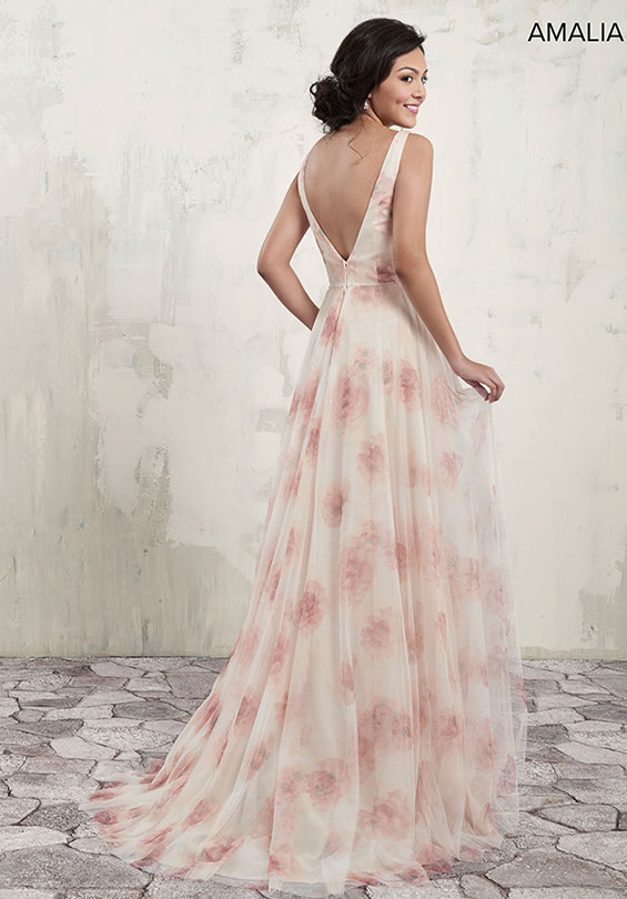 V-back, natural waist line, sweep train, and zipper closure. Available: Floral Print as shown only.